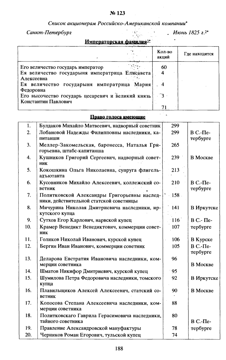 Список акционерам Российско-Американской компании*