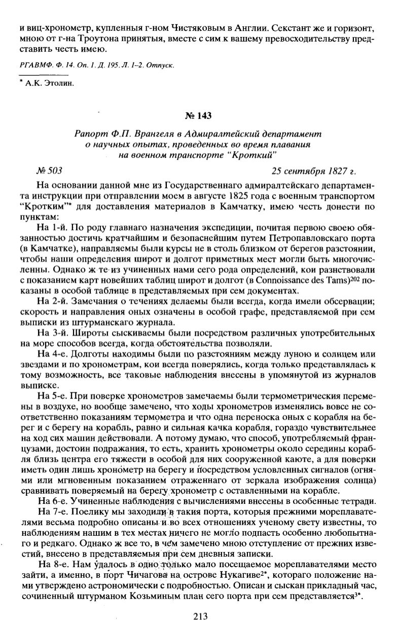 Рапорт Ф.П. Врангеля в Адмиралтейский департамент