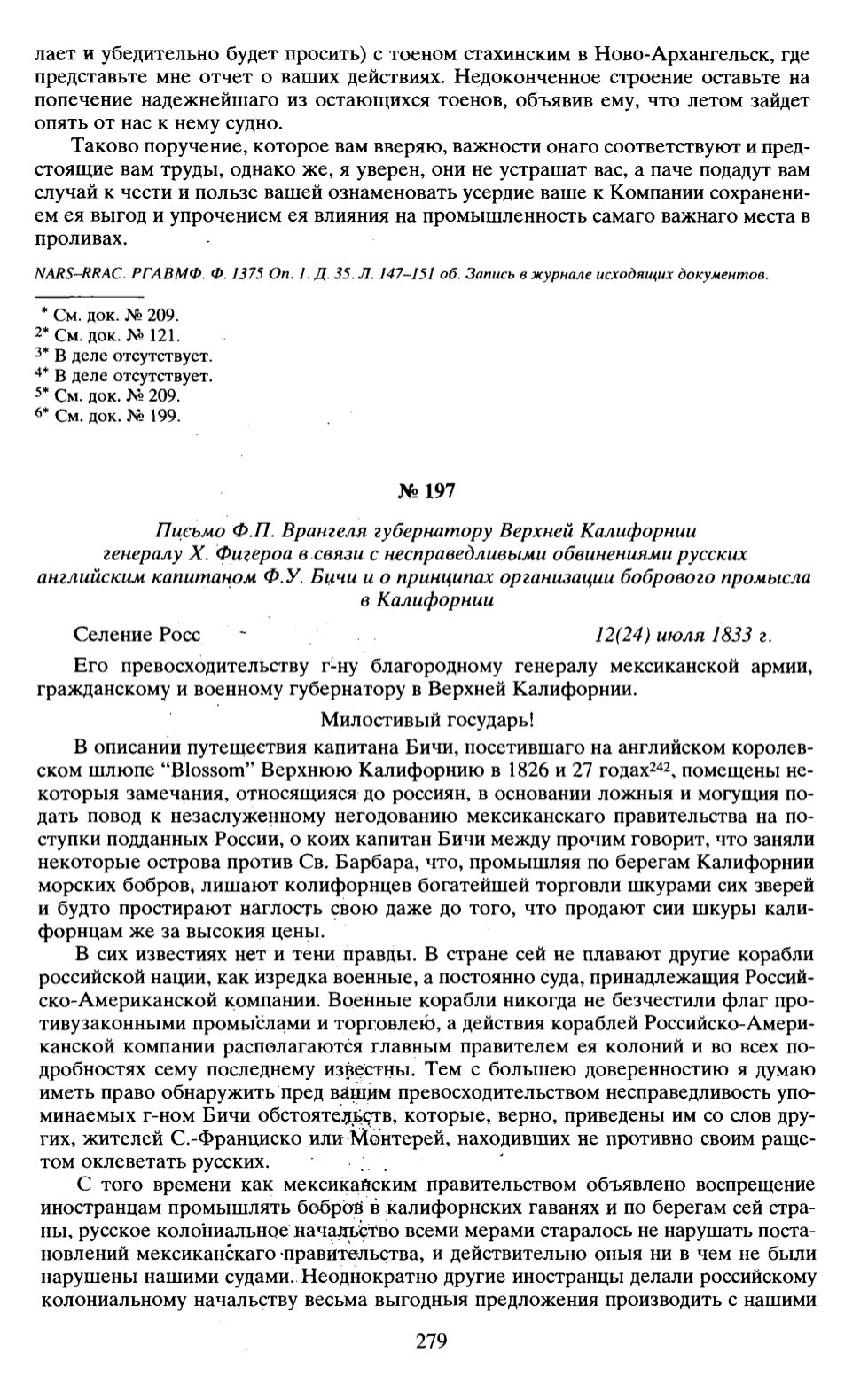 Письмо Ф.П. Врангеля губернатору Верхней Калифорнии