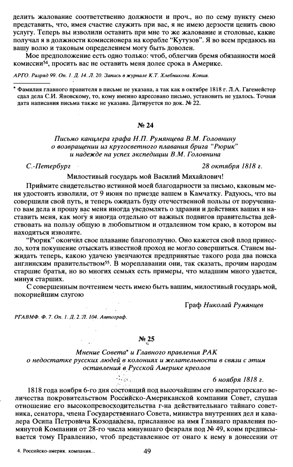 Письмо канцлера графа Н.П. Румянцева В.М. Головнину