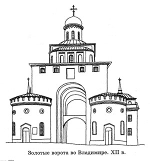 Скульптура не получила распространения в древнерусском искусстве, поэтому рельефы владимиро-суздальских храмов уникальны. Но не только культовое зодчество процветало во Владимире. В середине XII в. город был окружен деревянной крепостной стеной с несколькими каменными воротами. Одни из них, Золотые, сохранились до наших дней, правда, в сильно искаженном виде. Они напоминают высокую триумфальную арку. В древности над ней был водружен одноглавый храм, а створки ворот обиты листами начищенной, сверкающей меди. Отсюда и название ворот – Золотые. В 1237 г. Золотые ворота приняли главный удар татар, наступавших на город со стороны равнины. Враги не смогли прорваться через ворота и вынуждены были проламывать крепостные стены.