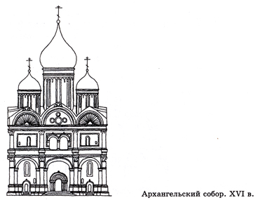 Через площадь, напротив Успенского, стоит еще один собор, построенный итальянцами, – Архангельский. Его внешний облик необычен для Руси и больше напоминает венецианское палаццо (дворец), чем русский средневековый храм. И это неудивительно: строителем собора был венецианский зодчий Алевиз Новый. Он-то и украсил фасады храма пилястрами с изящными капителями, сложными карнизами, вставил в закомары декоративные раковины, проделал на западной стене круглые окна, а северный и западный входы оформил красивыми резными порталами. В XVI в. собор был еще наряднее, чем сейчас. С трех сторон его окружала арочная галерея, а над закомарами стояли декоративные башенки – фиалы.