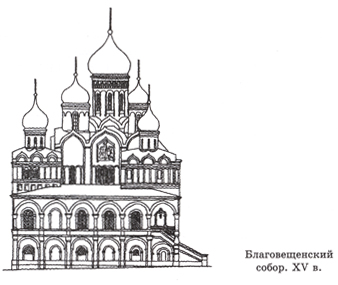 Комплекс царского дворца включал несколько храмов. Главным из них был Благовещенский собор. Он строился одновременно с Грановитой палатой, но русскими мастерами. Первоначально собор был трехглавым. Позже, в XVI в., его обнесли крытой галереей с четырьмя приделами, отмеченными главками, а над главным объемом надстроили еще две главы. Так у храма появилось девять золоченых куполов.