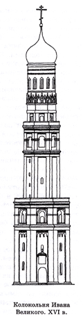 У Ивана Великого мощные стены – до 5 м у основания. Это, пожалуй, рекорд для древнерусского некрепостного зодчества. Внутри колокольни находится лестница (329 ступеней), ведущая наверх. В XVI в. к колокольне была пристроена звонница, увенчанная куполом. Сейчас на ней висит 21 колокол, в том числе, может быть, самый крупный из действующих в мире – 70-тонный Успенский.