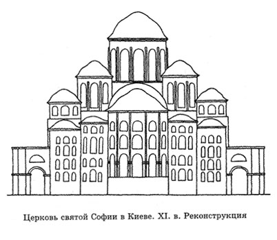 Зодчие заложили большой пятинефный храм (кстати, в самой Византии строили только трехнефные церкви). Видимо, хотелось Ярославу иметь собор не хуже царьградского. Храм окружили с трех сторон двумя галереями. По углам с западной стороны соорудили две башни. Винтовые лестницы внутри них вели на второй ярус галерей и просторые хоры. Подлинным украшением собора стало многоглавие. Двенадцать разновеликих куполов (некоторые исследователи считают, что первоначально их было 25) образовали пирамидальную композицию, группируясь вокруг самого большого купола – тринадцатого.
