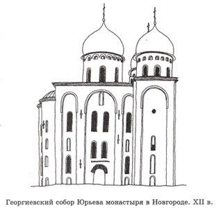 На территории старинного Юрьева монастыря, выше по течению Волхова, волею Всеволода Мстиславича, последнего новгородского князя, в начале XII в. был сооружен монументальный Георгиевский собор. Композиция его необычна. Основной объем увенчан двумя главами – центральной и угловой. К северо-западному углу храма пристроена лестничная башня с отдельной главой. Так храм стал трехглавым.