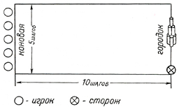 Все играющие, кроме сторожа, становятся на противоположной от городка короткой линии, которая называется «коновой». Сторож становится сбоку построенного городка. У каждого играющего в руке палка. Начинающий игрок бьет палкой в городок.