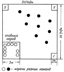 Для игры требуется квадратная площадка 20x20 м или 40 х х40 м. Можно играть и в прямоугольнике размером не менее 12 ж в ширину. По четырем углам площадки чертится три города 1x1 л и четвертый, главный, – 3 х 3 м (или немного меньше, если играющих не более 16 человек).