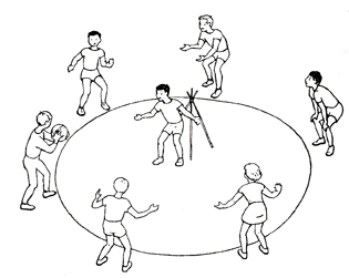 На земле чертится большой круг до 10 м в диаметре, если в игре участвуют не менее десяти человек. Играющие делятся на две команды. Одна команда находится за кругом – это водящие, другая в круге – это игроки. Водящие стараются попасть мячом в игроков, находящихся в круге, которые увертываются и в то же время могут ловить мяч. Игрок, осаленный мячом, временно выбывает из игры. Игрок, поймавший мяч, осаленным не считается и имеет право выручить одного из выбывших из игры. Игра проводится установленное время или до трех – пяти вышедших из игры игроков, после чего играющие меняются ролями. В заключение отмечается тот, кто больше подстрелил игроков поля за установленное время или кто меньше затратил времени на то, чтобы осалить мячом условленное количество игроков поля.