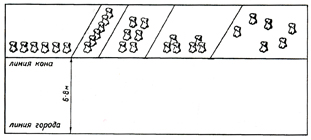 Напротив каждого города (квадрата) на расстоянии 5 м чертятся короткие линии по 2 м, называемые «полуконом», еще дальше, на расстоянии 10 м от городов, – также две короткие линии, называемые «коном». Сбоку кона и полукона проводятся боковые линии.