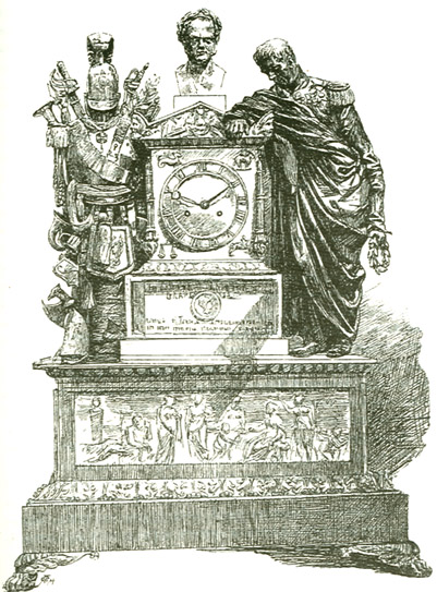 Великий Князь подробно осматривал их. В его присутствии заведены были и знаменитые часы. Они, по смерти императора, были заказаны Аракчеевым в Париже, за громадную по тому времени сумму – 29 000 руб. ассигнациями и должны были бить только один раз в сутки: в 10 часов 60 минут по полуночи – час кончины Государя. Когда их пустили при нас в ход, медленно открылся медальон императора Александра I и зазвучала грустная «вечная память». Уныло разносился звон часов по небольшой комнате, только не было на кушетке, стоящей подле, самого Аракчеева: говорят, во время боя часов он всегда сидел на ней. Небольшая, но мастерски исполненная бронзовая фигура его на часах была полна неописуемой грусти.