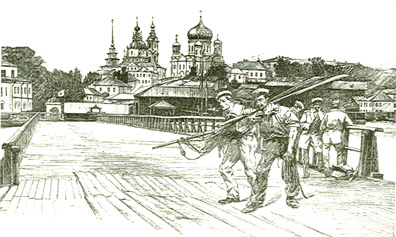 Около семи часов вечера, доносившийся до нас звон колоколов возвестил о приближении к Белозерску; городок не замедлил выясниться влево от нас; он раскинулся по совершенно пологому, низменному берегу Белоозера и к приезду Его Высочества разукрасился флагами и зеленью. Когда пароход остановился и Великий Князь сошел на берег, сквозь густые толпы народа едва можно было проехать в экипажах.