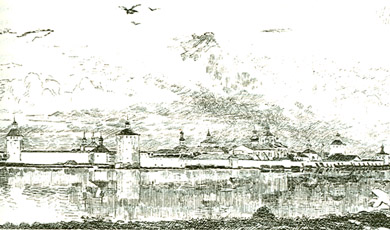 Когда подъезжаешь от Гориц к Кириллову монастырю, перед нами возникает он на берегу озера настоящею, внушительною твердынею в двух своих оградах со множеством куполов. Таких град нынче не делают: цели нет. Внутренняя имеет 10 аршин вышины при 1 1/2 аршинах ширины; наружная – 16 при 9 1/2. За такою бронею и свое время можно было отсидеться. Тихо плещется у стен монастыря Сиверское озеро. Низкие берега его кажутся еще площе, еще низменнее в соразмерности с монастырскими твердынями, плывущими над тихою гладью темных озерных вод. Пейзаж строг, задумчив, но немрачен.