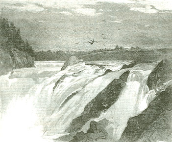 Еще несколько шагов, и лес отступил совсем, и свирепый «падун» во всей дикой красе своей явился перед нами, влево от моста, перекинутого через Суну. Моста этого еще недавно не было, и не было поэтому лучшего вида на Кивач, с расстояния каких-нибудь ста сажен, прямо лицом к лицу с водопадом, во всей совокупности богатого пейзажа скал и лесов, обрамляющих его, с большим павильоном, поставленным справа, и небольшою беседкой с левой стороны.