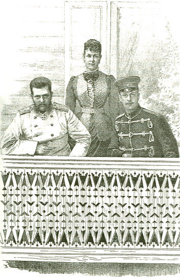 | На балконе павильона перед водопадом Кивач (слева направо): вел. князь Владимир Александрович, вел. кн. Мария Павловна, наследный герцог Иоганн Альбрехт фон Мекленбург-Шверин |