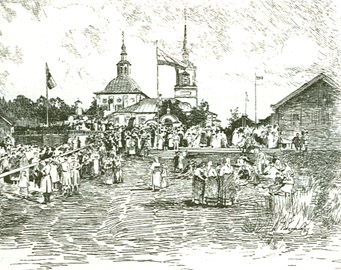 Около 9 часов утра пароход снова бороздил Сухону, которая, несмотря на то, что была у нас перед глазами уже второй день, не могла не нравиться. Берега по-прежнему высоки, волнисты, покрыты лесами; порой виднеются поперечные долинки; на берегу зачастую заметны временные становища рыбаков и их заколы. Здешние села отличаются красивыми, прочными избами, большею частью двухэтажными, с балкончиками и далеко вперед выступающими навесами крыши на швейцарский лад. В том, что и внутри избы эти хороши и чисты, могли мы убедиться с самою полною наглядностью приказания, данного Великим Князем, неожиданно остановить пароход подле села Нюксеница, расположенного на высоком левом берегу реки. Всполох в мирной деревне был очень велик, когда во множестве стоявшие на берегу сельчане в изумлении заметили поворот, делаемый пароходом. Надо было видеть с рубки эту суетню и беготню, поднявшуюся в неожиданно посещаемой Великим Князем лежащей совсем в стороне ото всяких путей и вне маршрута деревни! Но откуда что взялось! Принесли бабы полотна и разостлали их дорожками; появилась хлеб-соль во многих экземплярах; одна из солонок изображала довольно большого, крашенного синею краской деревянного двуглавого орла, в спине которого лежала соль. Зазвучала также песня, и мелькнули по сторонам крынки с молоком для угощения. Великий Князь, сойдя на берег, взошел в избу крестьянина Казакова, обошел ее всю и подробно расспрашивал о местных заработках, о порядке посевов, о том, как, когда и чем занима