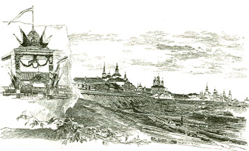 Порядок во все время нашего пребывания в Вологде был самый полный; тут не могло быть той красоты обстановки, что в Ярославле, но радушия, радости, осенения крестными знамениями, кликов, летающих шапок и мелькающих платков было вволю. Вечером 5 июня перед домом губернатора, на реке Вологде, сожжен был замечательно хорошо приготовленный отставным местным бомбардиром фейерверк; желтые, лиловые и зеленые краски бенгальских огней были исключительно хороши; треск фугасов и щелканье ракет покрывали собою бессчетные голоса неподвижно стоявшей по обоим берегам реки толпы; на самой реке сновали во множестве челноки и ялики. Вечер был достаточно свеж, чтобы напомнить нам о предстоящем пути нашем на далекий север.