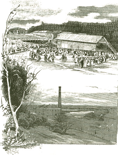 Фабрика основана в 1851 году и вырабатывает пряжи, полотен и изделий на 680 000 рублей. Леннопрядильная и ткацкая действующего 50-сильною паровою машиной, для отбельной имеется машина в 20 сил; все аппретурные машины двигаются водяным колесом в 25 сил; рабочих на ней 1000 человек; лен до 30 000 пуд скупается в полуобработанном виде в уездах Устюжской и Сольвычегодской, а главный сбыт изделий – столицы, ярмарки Нижегородская и Ирбитская. В том, что количество полотен, вырабатываемых на фабрике, велико, убедились мы еще издали, с парохода, так как поверхность одного из холмов была устлана белившимся полотном и напоминала солдатский лагерь; это отбеливание полотна производится не один, а несколько раз. Пряжи работаются здесь нумерами, с 10 по 145, то есть фабрика не производит самых толстых сортов, до нумера 10, и не занимается вовсе батистовым производством, с нумера 145 и выше. Из хорошо вычесанного льна производятся тонкие полотна, из оческов или пакли работают более грубые фламские полотна – равентухи и коломянки. Все более тонкие сорта, все скатерти и салфетки делаются здесь ручною работой машинами, то есть ткацкий станок приводится в движение ногой, а челнок пропускается поперек пряжи посредством привода, подергиваемого рукой. Очень любопытно воплощение различных рисунков посредством картонажей с прорезными дырочками: чем сложнее рисунок, тем больше картонок. Все это производство должно быть отнесено к чистым, если исключить пакольную пыль в чесальной и запах хлора в белильной. Изобразителями чистоплотности являются 10 красных молотов, очень приличных размеров, заменяющие прачек. Самая большая ширина пряжи, здесь выделываемой, три аршина; хорошая работница при задельной плате получает 10-12 руб. в месяц; за пуд льна платят от 6 до 8 руб.