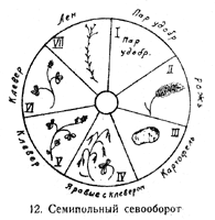 первая половина этого севооборота одинакова с только что приведенным севооборотом; но только в яровом поле льна не сеют, а в яровые хлеба весною подсевают клевер, который и держится обычно два года, и уже только после двух лет клевера сеют лен. Здесь лен возвращается на свое прежнее место на седьмой год.