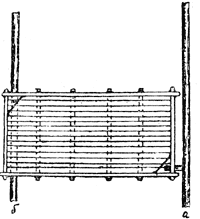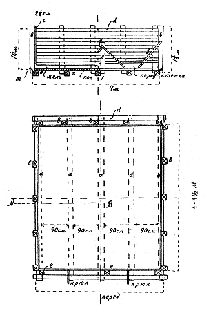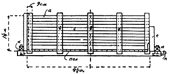 Пять деревянных брусьев (а), длиною каждый в 4-4 1/2 м, кладут на землю на расстоянии один от другого в 90 см, и соединяют друг с другом двумя перекладинами (д)—одна с одного конца, другая с противоположного. На брусья настилают пол из дюймовых досок. К крайним брусьям боковых длинных сторон ящика и в задней его стороне прикрепляются по пяти железных скоб (т), в которые вставляются стойки (в) высотою в 1 1/2 м. Эти стойки обшиваются дюймовыми досками, образующими стенки ящика. Ящик имеет только три стенки—две боковых (длинных) и одну заднюю. Задняя стенка и одна из боковых не доходят сантиметров на 9 - 10 до пола ящика, образуя щели. В эти щели входит при мочке вода. Передняя стенка ящика состоит только из одной доски шириною в 20—22 см, которая прикреплена у самого дна ящика к трем коротким передним стойкам (е). Одна из этих трех стоек (средняя) делается выше двух других, достигая вышины 1 м. К этой стойке прикреплена перекладина, которая другим концом приделана к средней же стойке задней стенки ящика и таким образом делит его пополам. Для того, чтобы сделать ящик прочнее, боковые стенки его и средняя передняя стойка скрепляются железными раскосами (д) с передней