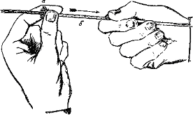 Когда ящик стал погружаться в воду, необходимо особо внимательно следить за мочкой, чтобы не перемочить льна. Поэтому следует возможно чаще делать пробы на готовность льна. Для этого нужно брать пробные пучки тресты из различных мест ящика. Если лен вымок (готов), то кожица со стебля легко сходит в виде грязной зеленоватой слизи при протаскивании стебля между пальцами руки (рис. 38). Если у такого льна надломить стебель у комлевого конца и, отделив сначала в этом месте волокна от древесины, начать стягивать их, то волокна эти сходят совершенно легко почти по всей длине стебля.