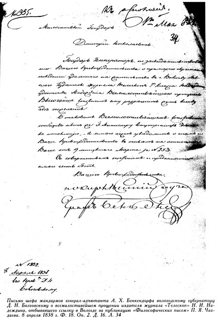 Отношение военного губернатора г. Вологды и вологодского гражданского губернатора Д. Н. Болговского шефу жандармов графу А. X. Бенкендорфу о пребывании в вологодской ссылке издателя Н. И. Надеждина[1]