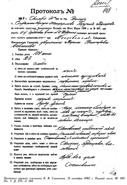Джугашвили родился в г. Гори Тифлисской губ., воспитывался в Тифлисской духовной семинарии, вышел из 5-го класса. В 1902 г. привлекался при Тифлисском губернском жандармском управлении к дознанию обвиняемым по делу о тайном кружке РСДРП в Тифлисе, за что на основании высочайшего повеления, последовавшего в 9 день июня 1903 г., был сослан под гласный надзор полиции в Восточную Сибирь на три года. 5 января 1904 г. из места водворения скрылся и разыскивался циркуляром департамента полиции от 1 мая 1904 г. за № 5500.