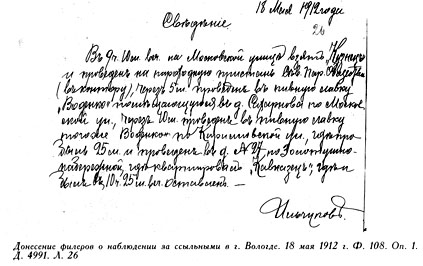 Донесение филеров о наблюдении за ссыльными в г. Вологде. 18 мая 1912 г. Ф. 108. On. 1. Д. 4991. Л. 26