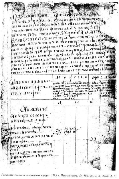 К сей ведомости вместо вологодской купецкой жены Василисы Аебединовой за неумением ее грамоте и писать по личному прошению вологодский купец Иван Васильев сын Лебединов руку приложил.