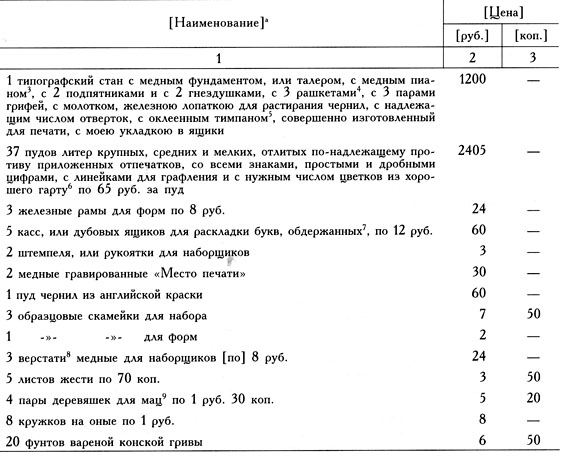 Реестр инструментам, потребным для заведения губернской типографии на один стан