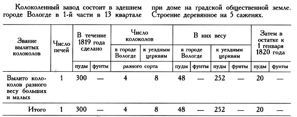 Колоколенный завод состоит в здешнем при доме на градской общественной земле, городе Вологде в 1-й части в 13 квартале при доме на градской общественной земле. Строение деревянное на 5 саженях.
