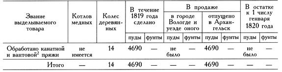 На 3-е: В г. Вологде имеются кожевенные, салотопные и свечные заводы, прядильни и канатная фабрика. Но товар для обрабатывания на оных получается большею частию из других губерний. Юфти выделывается от пяти до десяти тысяч пуд[ов], сала – от десяти до двадцати тысяч, свечей – от восьми до десяти тысяч, пряжи пеньковой, канатной и вантовой – от тридцати до пятидесяти тысяч пуд[ов]. Все оные товары доставляются для заморского отпуска в г. Архангельск и частию в Петербург.