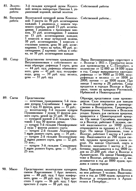 2. Ярмарка в г. Вологде существует каждогодно как оптовая, так и розничная, и оная хотя разрешена к открытию с 15 января каждого года, но главнейшая торговля начинается с 22 числа. К этому времени более стекается из разных местностей и в значительном количестве народ.