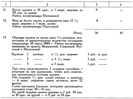 Список кружевных изделий воспитанниц Вологодского Александрийского детского приюта, отобранных для Всемирной выставки в г. Чикаго[1]