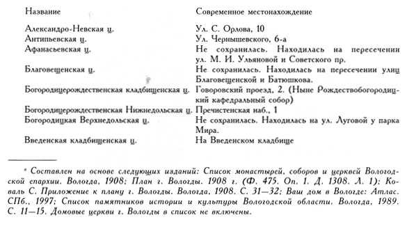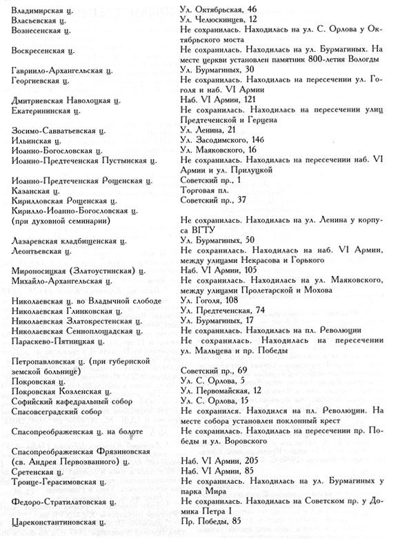 [a] Для составления списка использовались следующие материалы: План г. Вологды 1871 г. (ГАВО. Ф. 475. On. 6. Д. 4); План г. Вологды 1886 г. (ГАВО. Ф. 7. On. 1. Д. 754); План г. Вологды 1908 г. (ГАВО. Ф. 475. On. 1. Д. 1308. Л. 1); Вологда и ее окрестности: Карта. СПб., 1993; Церкви и улицы старой Вологды: План-схема. Вологда, 1997; Ваш дом в Вологде: Атлас. СПб., 1997; Суворов Н. Вологда в начале XVIII столетия // Памятная книжка для Вологодской губернии на 1861 г. Вологда, 1861. С. 1 – 104.