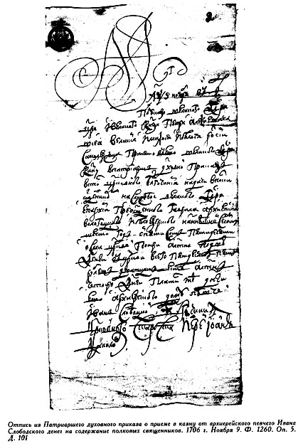 Десятинной пашни 846 десятин. На той пашне в посеве бывает: ржи 248 четвертей 2 четверика, яроваго 702 четверти 6 четвериков; итого 951 четверть. По ведомости ис трех годов в умолоте в [1]721-м году в приплоде сверх семян было: ржи 915 четвертей 2 четверика, яроваго 970 четвертей 6 четвериков 1/2 итого 1886 четвертей с получетвериком. А с оброчных: ржи 1154 четверти 1 четверик, яроваго 1289 четвертей 2 четверика 1/2 итого 2443 четверти 3 четверика ? Сена в укосе 14 429 копен. Из вышепи-санных доходов в росходе на церковныя и домовыя потребы: денег 1307 рублев 81 копейка 1 г, хлеба 1231 четверть 6 четвериков ?. В даче духовнаго чина казначею, иеромонаху и монахом денег 52 рубли, домовым всякого чина людем денег 442 рубли 85 копеек 1/4 хлеба 552 четверти 4 четверика; итого в росходе: денег 1802 рубли 66 копеек 3/4, хлеба 1784 четверти 2 четверика 3 четверти четверика. И за тем в остатке денег 1050 рублев 14 копеек 1/2 И которых по определению Монастырского приказу, что ныне Камор-кантора2, велено платить в тое Каморкантору, которые с [1]726 году и платятца. Хлеба 659 четвертей 3 четверти четверика. А с [1]721 году по вышеозначенной [1]726-й год те остаточные деньги и хлеб, как оставшеи так и оброчной, употреблено в домовой архиерейской росход...