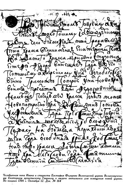 Умилостивися, государь преосвященный Гавриил архиепископ Вологодский и Бе-лоозерский, пожалуй нас, богомольца и приходских людей, вели, государь, от соборныя церкве к освящению того храма дать святый антимис и тот храм благослови, государь, освятить. Государь великий святитель, смилуйся.