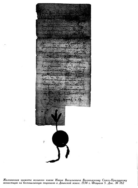 1534 г. Февраля 5. – Жалованная грамота великого князя Ивана Васильевича Вологодскому Спасо-Прилуцкому монастырю на беспошлинную торговлю в Двинской земле