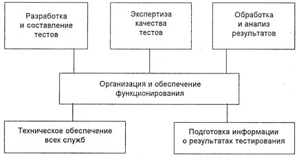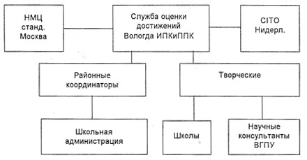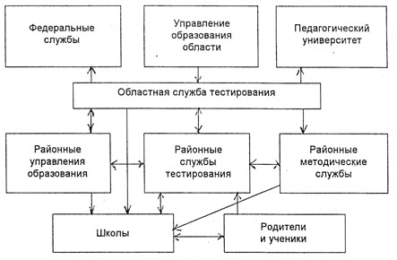 Первые результаты привлекли к тестированию внимание многих руководителей образования и педагогов области. Потребовались дополнительные технические средства и кадры для организации и проведения массовых измерений. В настоящее время служба тестирования имеет следующую схему координационных связей.