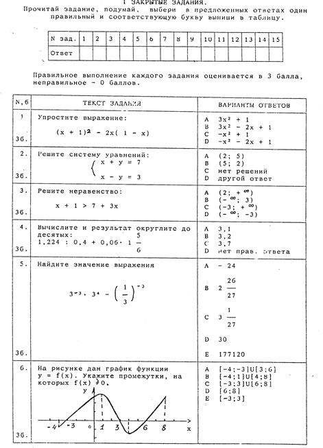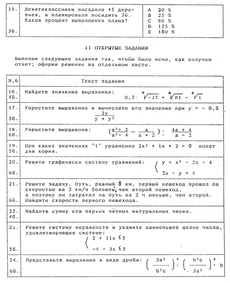 В тестировании по алгебре приняли участие 6887 учеников городских и сельских школ области. Тест состоял из 24 заданий, из них 15 заданий закрытого типа (с выбором ответа), 9 заданий открытого типа (предполагающих логическое обоснование) и рассчитан на 3 астрономических часа.