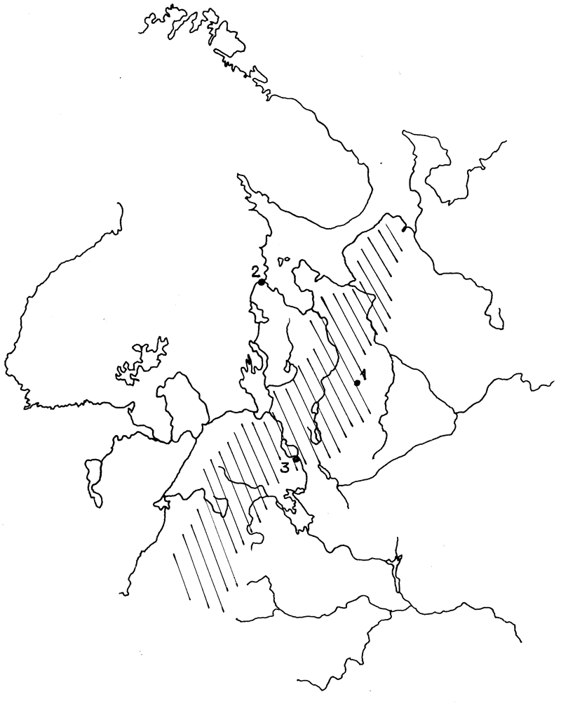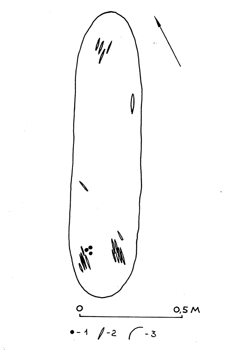 Погребальный обряд и связанный с ним инвентарь остаются одной из наименее изученных сторон культуры древнего населения, обитавшего в Северной Европе в III тыс. до н.э. В большинстве могильников этого времени, к сожалению, не сохранились костные остатки. Большая часть погребений, датируемых III тыс. до н.э., открыта благодаря наличию во многих могилах изделий из янтаря. Если бы древние люди в этот период не использовали в качестве погребального инвентаря янтарные украшения, то вместо достоверных могильников мы имели бы продолговатые охристые пятна, по которым можно было лишь предполагать, что в этом месте могли быть захоронения. Наличие в погребальном инвентаре янтарных украшений дало возможность датировать погребения. В некоторых случаях, благодаря многочисленности янтарных украшений, удается отчасти реконструировать погребальную одежду. Изделия из камня встречены в единичных погребениях. Керамические сосуды отсутствует во всех погребениях этого времени. Отдельные фрагменты керамики в пределах могильных ям следует рассматривать как попавшие из культурного слоя при засыпке погребения. Среди могильников, датируемых III тыс. до н.э., выделяется группа, где главной особенностью стало наличие в погребальном инвентаре достаточно большого количества наконечников необычно удлиненной обоюдоострой формы. Наконечники подобного типа пока ни разу не встречены на поселениях. На Севере европейской части России известно три пункта, где были исследованы могилы с удлиненными наконечниками (рис. 1). Это одиночная могила на поселении Ильинский Остров в Архангельской области (Козырева, 1971), могильная кладка на поселении Залавруга II в Карелии (Савватеев, 1977) и могильник Каргулино в Вологодской области (Ошибкина, 1978). Материалы этих погребений большей частью опубликованы, но никогда прежде во взаимосвязи не рассматривались. В отчетах Р. В. Козыревой имеется план одиночной могилы на поселении Ильинский Остров (рис. 2). Погребение было выявлено в виде охристого пятна на относительно небольшой глубине около 65–75 см от поверхности, ниже культурного слоя на 30–35 см (Козырева, 1971). Охристая линза имела длину около 1,5 м. В пределах охристого пятна было найдено четыре зуба, 23 удлиненных кремневых наконечника и три сломанных кинжала. У нескольких кремневых наконечников был обломан насад. Обломки кончиков стрел и некоторые части кинжалов в погребении отсутствовали. Погребение вытянуто в направлении юго-запад — северо-восток. Зубы найдены в юго-западной части погребения. Наконечники располагались в разных местах могилы. Два скопления наконечников найдены западнее и восточнее от зубов, одно скопление — в противоположной стороне могилы. В средней части могилы найден крупный наконечник стрелы. Стрелы в скоплениях ориентированны примерно так же, как и охристое пятно. Р. В. Козырева высказала предположение, что в могиле был похоронен мальчик, так как размеры охристого могильного пятна относительно невелики. В настоящее время, после раскопок М. П. Зиминой могильников Репище и Кончанское, стало ясно, что размеры охристых пятен в погребениях, как правило, меньше, (примерно на четверть) размеров могильных ям (Зимина, 1993). Судя по этим данным, в могиле на Ильинском Острове был похоронен взрослый человек. На Залавруге II главной отличительной особенностью погреб