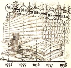 Из диаграммы видно, что в 1958 году объем вывозки древесины по сравнению с 1954 годом возрос больше чем в полтора раза.