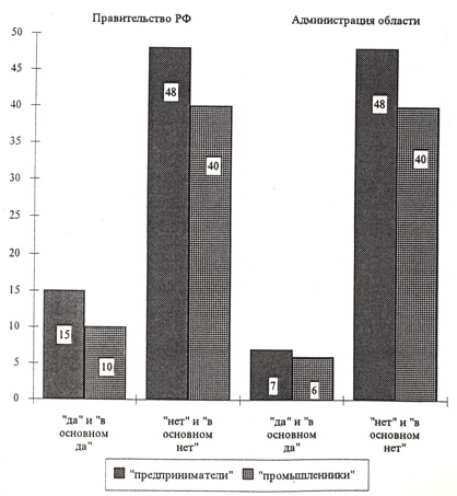 4. Частное предпринимательство начинает играть все более значительную роль в экономике города, поэтому необходимость повышения эффективности взаимодействия между ними и органами местной власти становится все более очевидной. Вместе с тем по данным опроса видно, что этот уровень еще очень низкий. По мнению большинства респондентов (76%), они не чувствуют ни помощи, ни противодействия со стороны государственных органов. Значительная часть руководителей (54%) не одобряют проводимую администрацией политику в отношении частного бизнеса.