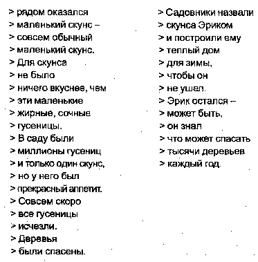 При выполнении этого урока не пользуйтесь тренировочной карточкой. Просто скользите глазами вниз по каждой колонке текста, делая по одной фиксации на строке. Старайтесь избавиться от чрезмерной опоры на внутреннюю речь, следуйте за основной идеей автора. Без сомнения, вы уже заметили, что этот текст прост по структуре и содержанию - это сделано для того, чтобы ваше чтение как можно меньше зависело от внутренней речи. Впоследствии упражнения такого типа будут усложняться.