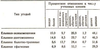 Таблица наглядно показывает, сколь различна степень использования шишек белкой и другими животными, засухой), случаются реже и имеют меньший масштаб, ельники болотисто-травяные и сфагновые используются белкой в качестве кормовых угодий значительно слабее, чем густые и высокоствольные ельники-зеленомошники.