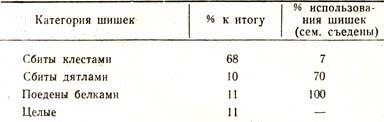Приведенные в таблице данные показывают, что клесты, сбивающие 3А всех шишек, часто роняют их, не успев достать ни одного семечка. Следовательно, деятельность клестов скорее полезна, чем конкурентна для белки, так как сбитые ими шишки используются белкой зимой, а также весной и летом следующего года. Если бы шишки оставались висеть на дереве, то, высохнув, они рассеяли бы по ветру свои семена, и белка осталась без корма.