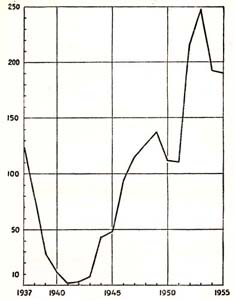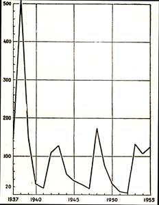 Рис. 31. Колебание численности крота европейского в Вологодской области. (По данным пушных заготовок в % к средней за 1937 – 1955 годы)