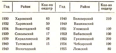 В 1939 году 17 голов ондатры было выпущено в реку Пельшму Сокольского района. Из Сокольского и Сям-женского районов она проникла в реки Сорг, Двиницу и Вотчу Биряковского района. В том же 1939 году 28 ондатр было выпущено в водоемы Кирилловского района, и они расселились по озерам Белоусовскому, Бибишкин-скому и Зауломскому. В 1940 году был произведен выпуск 15 ондатр в водоемы Тотемского района и 210 – в водоемы Белозерского, Вашкинского и Вологодского районов.
