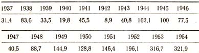 В первые годы после выпуска заготовки шкурок ондатры не производились. Лишь отдельные экземпляры зверьков, выходящие за пределы охраняемой зоны, становились иногда добычей охотников. В 1932 году на Вологодскую базу «Пушногосторга» поступило всего 5 шкурок, а в 1933 году – 23 шкурки ондатры. Отлов ее на пушнину начался в области с 1935 года, когда было добыто 75 шкурок. В дальнейшем промысловое значение ондатр из года в год увеличивалось, о чем свидетельствует приводимая ниже таблица, показывающая заготовку шкурок зверька в процентах к 1945 году (по материалам областной конторы «Заготживсырье»).
