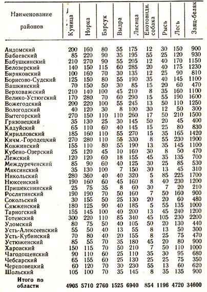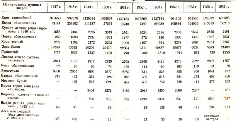 Приводим также таблицу заготовок шкурок ондатры (в штуках) по Вологодской области, начиная с 1947 года (по данным облконторы «Заготживсырье» и облпотребсоюза).
